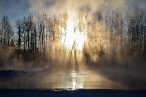 Sunlight filters through a foggy tree canopy over the Flathead River near Old Steel Bridge.